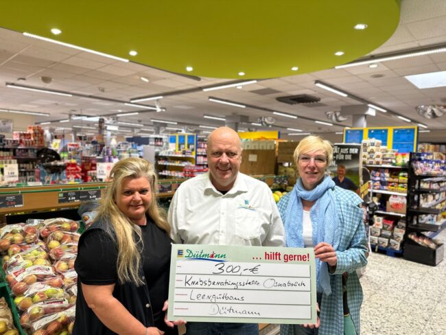 Bad Iburg. Mit einer Spende über 300 Euro unterstützt Edeka Dütmann die Osnabrücker Benediktinerinnen und ihre selbstlose Arbeit in der Region. Ralf Zumstrull und Herr Stükas, Mitarbeiter des Dütmann Markts in Bad Iburg, überreichten einen symbolischen Scheck im Namen von Guido Gartmann, dem Inhaber von Edeka Dütmann, an Schwester Hanna (links) und Schwester Angelica (rechts).…