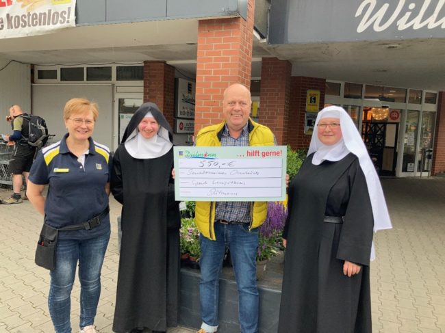 Osnabrück. Über eine Spende i.H.v. 550,– Euro freuen sich die Benediktinerinnen aus Osnabrück. Edeka-Dütmann Inhaber Guido Gartmann, vertreten durch Ralf Zumstrull und Gundula Sommer vom Dütmann-Markt in Bad Iburg unterstützen die Schwestern und sammelten hierfür Pfandbons im Wert von insgesamt 550,– Euro. Der Dütmann Scheck wurde von Schwester Angelica (links) und Schwester Josefine (rechts) dankend…