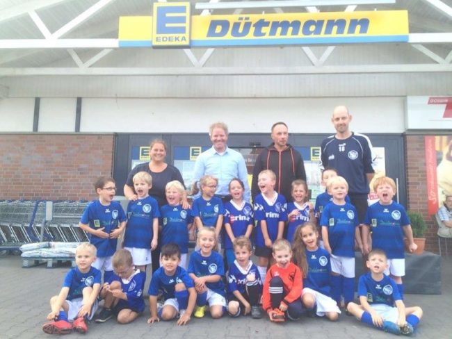G1: Ein neuer Trikotsatz für den BSV Holzhausen Georgsmarienhütte/Holzhausen. Viele Tore wollen die kleinen Dribbelkünstler vom BSV Holzhause in der neuen Saison bejubeln. Für den richtigen Auftritt bekamen die jungen Kicker kurz vor der Saison neue Trikots und Hosen vom Frischespezialisten EDEKA Dütmann. In blau und weiß laufen sie künftig mit dem Logo vom EDEKA Dütmann…