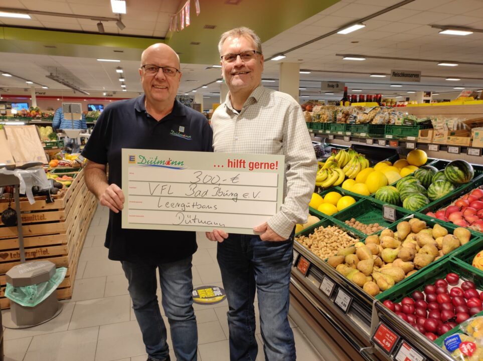 Mit einer Spende über 300,–Euro unterstützt Edeka-Duetmann Inhaber Guido Gartmann den VfL Bad Iburg. Ralf Zumstrull überreichte im Namen von Guido Gartmann einen symbolischen Scheck an den Vorsitzenden Herrn Jörg Nuxoll. Die Spendensumme wurde durch Pfandbons unserer Kunden in Bad Iburg ermöglicht.