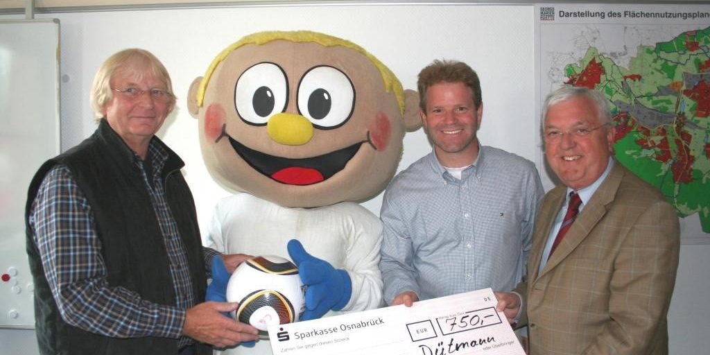 Im Rahmen des zweiten Dütmann-Cup verkauften die Auszubildenden von Neukauf Dütmann Lose zugunsten der Stiftung. Dank der großen Teilnahme von Zuschauern und Besuchern kam insgesamt ein Erlös von 750 Euro zusammen. Diesen Betrag übergaben Guido Gartmann und Düti an den 1. Vorsitzenden Bürgermeister Heinz Lunte und dem 2. Vorsitzenden Hartmut Klipsch, die sich sichtlich über die Spende freuten.